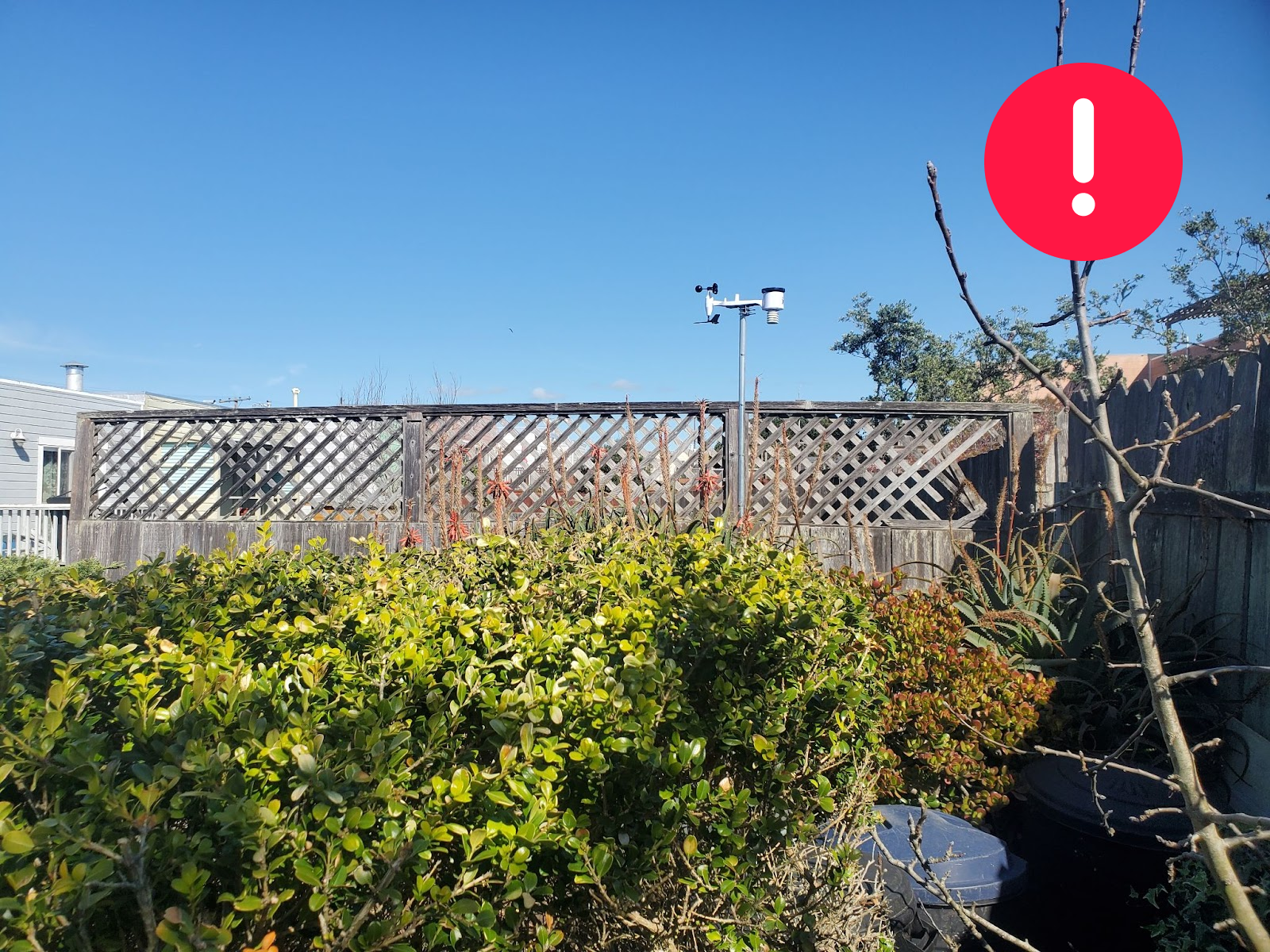 The station has not been deployed at the highest possible place because there are higher buildings around. It is placed on a fence being only ~1m higher from it and there are objects (like the bush) that are closer than 2m, which is the smallest allowed distance between the sensors and any horizontal surface under the level of the outdoor sensor.